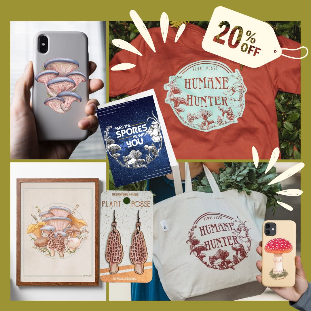 Sustainable wood jewelry derived from original watercolor paintings, screen printed on die-cut, lightweight wood. Also fungi-themed stickers, Eco-prints, Fungi Fanny Packs, Fungi Prayer Flags, sustainable greeting cards, t-shirts and recycled canvas tote bags.